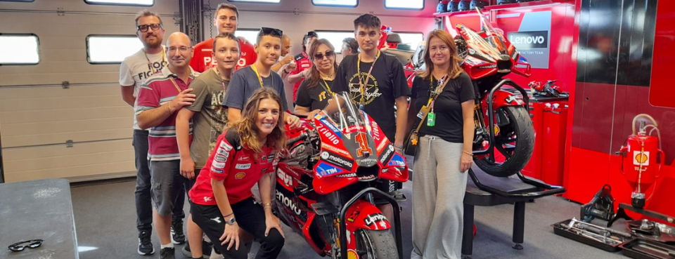 L’Official Pecco Fan Club di Chivasso ha preso in carico e organizzato al meglio la trasferta dei ragazzi a Misano, il pernottamento e anche una visita esclusiva – nella giornata di sabato 9 – nel paddock della Ducati. Un’esperienza unica, destinata agli ospiti di riguardo. Qui gli adolescenti di UGI hanno potuto anche intrattenersi con i tecnici della scuderia per sapere tutto sulle moto da competizione della casa.